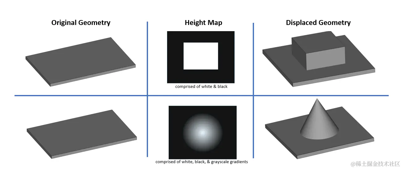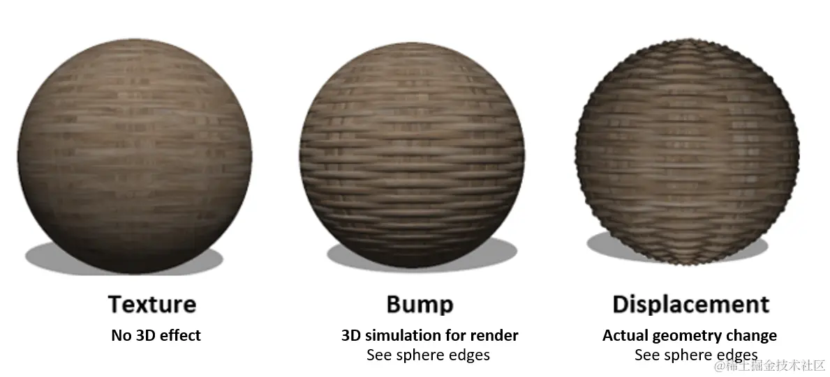 将此模拟的凸块几何形状更改为已改变的曲面几何形状的过程称为位移。置换贴图将应用为纹理的凸起/高度贴图,并使用它来位移网格几何体的表面,以赋予其真实的高点和低点。