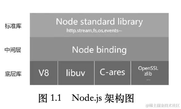 Node主要由标准库、中间层和底层库3部分组成,其框架如图1.1所示。