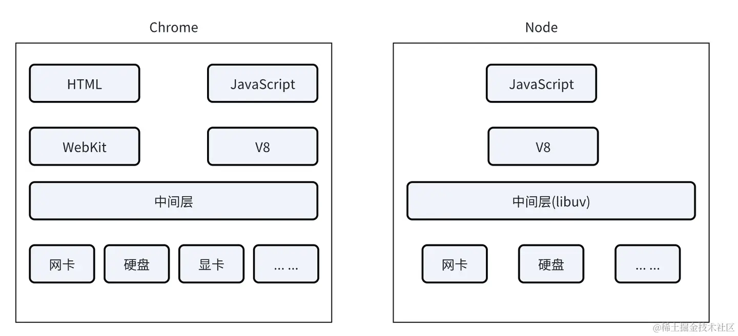Node与浏览器的功能类似,他们都是基于事件驱动的异步架构。浏览器通过事件驱动来服务界面上的交互,Node通过事件驱动来服务I/O。Node可以使JavaScript运行在任何环境中,而并非局限于浏览器。