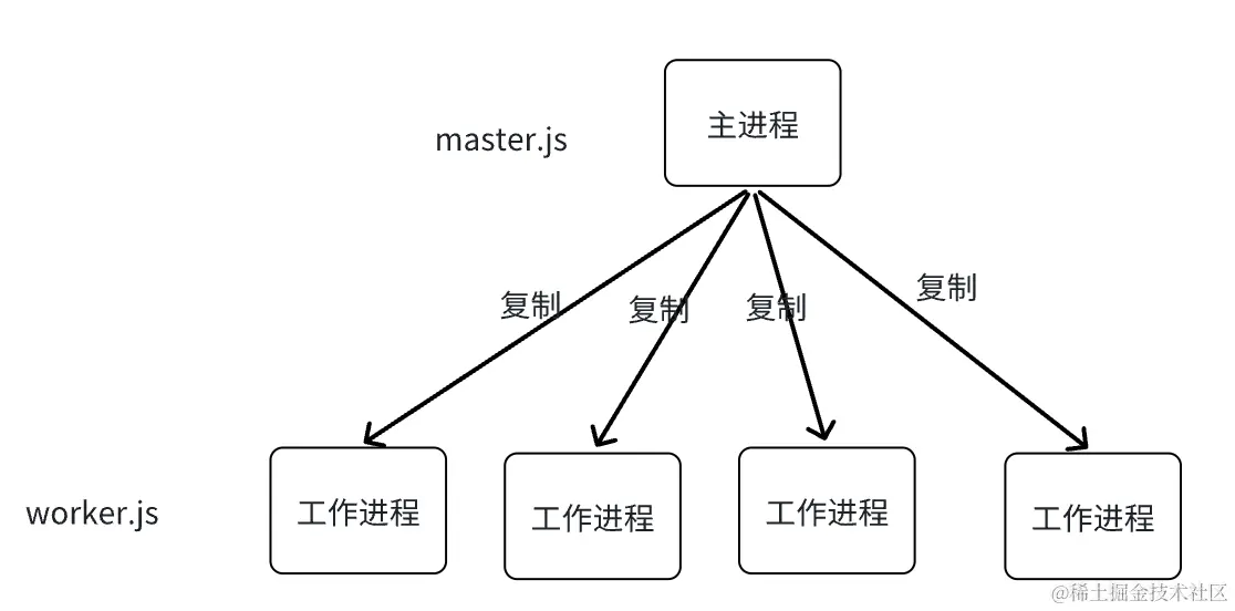 Master-Worker模式又称为主从模式,Node中的进程被分为主进程和工作进程,是典型的分布式架构中用于并行处理业务的模式,具备良好的可伸缩性和稳定性。主进程不负责具体的业务处理,而是负责调度和管理工作进程,它是趋于稳定的。工作进程负责具体的业务处理。