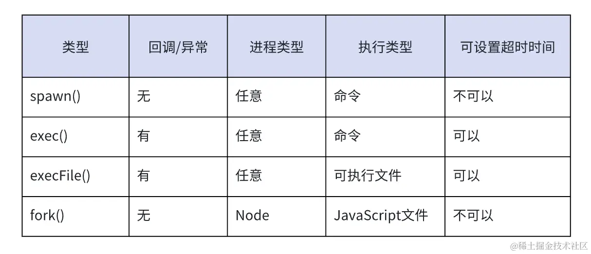 - fork():与spawn()类似,不同的是它创建的Node子进程只需要指定要执行的JavaScript文件模块即可