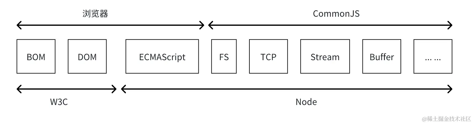 - 标准库:提供了开发人员能够直接进行调用的API,如http模块、stream模块、fs模块等,可以直接使用JavaScript代码调用;