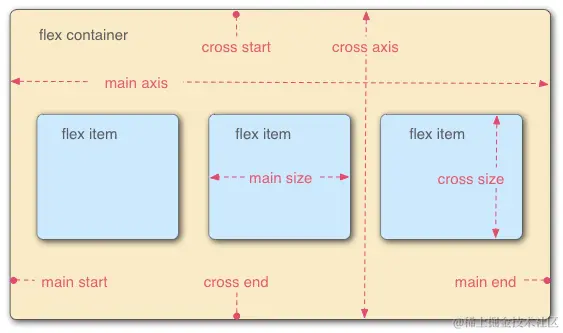 flex容器中有两条默认轴,水平主轴和垂直的交叉轴; flex容器中的每个单元块称为 flex item;