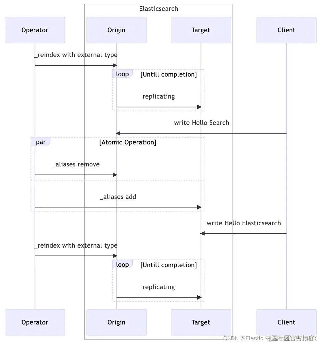 那么,如果第二个 _reindex 有人修改了新索引中的文档怎么办? 例如,如果有人在新索引中将 Hello Elatic 更改为 Hello Elasticsearch,是否会被旧值覆盖? 整个过程如下所示。