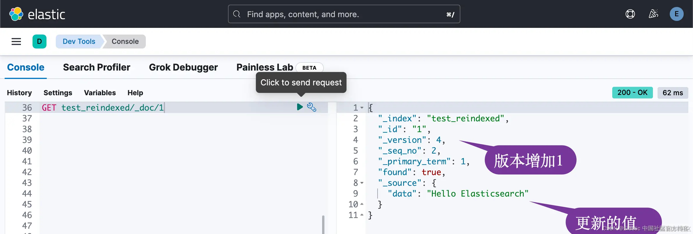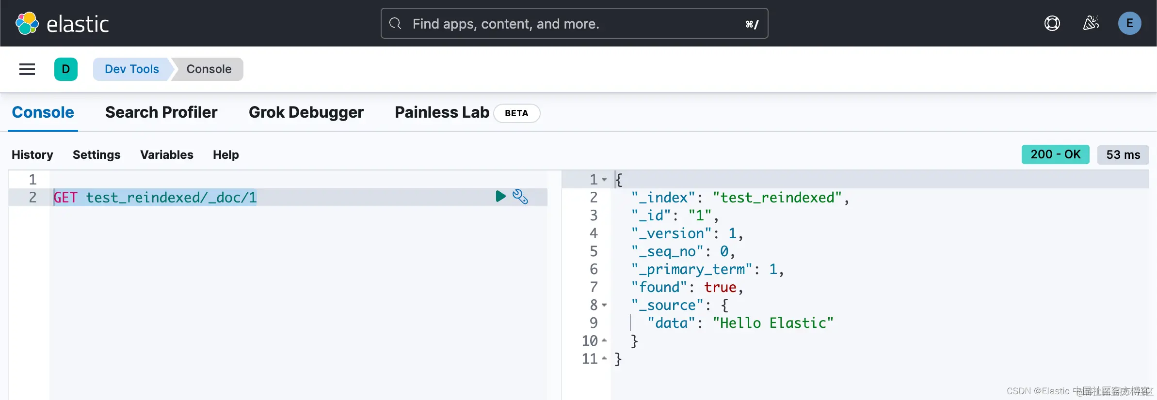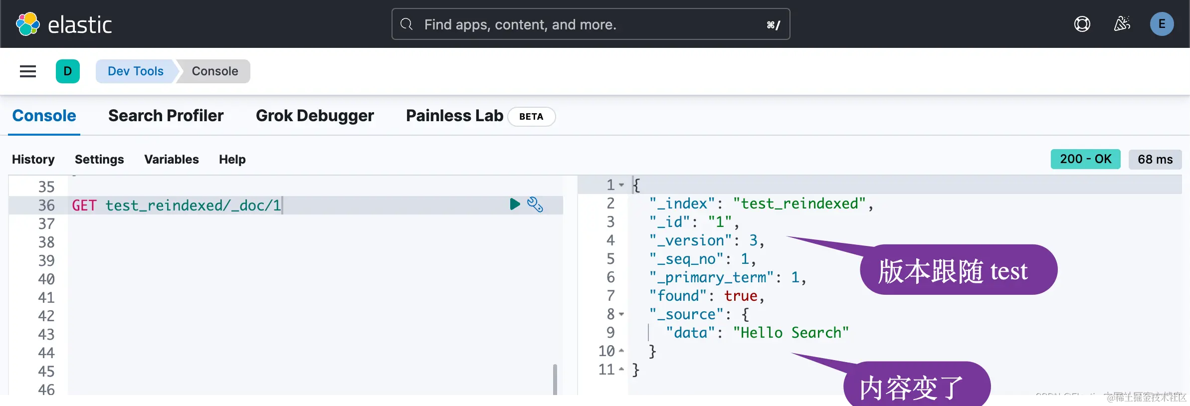 我们把 test_reindexed 中的文档的值修改为 Hello Elasticsearch:
