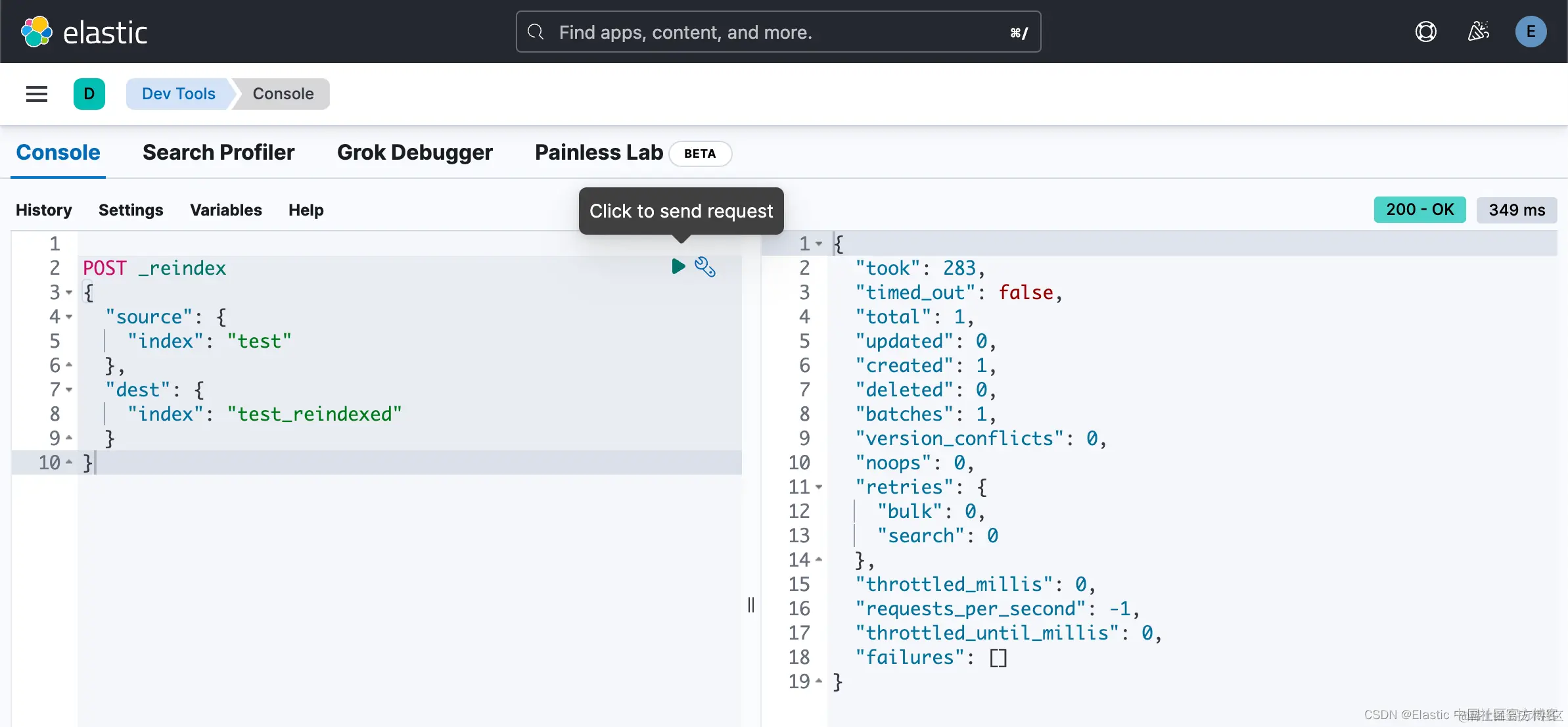 我们可以看到它们的版本号码是一致的。我们运行如下的 reindex: