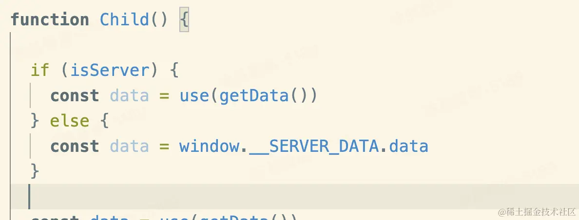 退一步讲,我们阉割服务端的能力,约定只在 server 端执行 fetch 操作,按照这样的模式开发下去,组件内执行 fetch 的地方都要去区分 server 端和 client 端的逻辑,还得考虑 server 端把数据拼接到 html 里面让 client 端直接读这个数据,这样才能保证 server 端和 client 端的“同构”。类似这样: