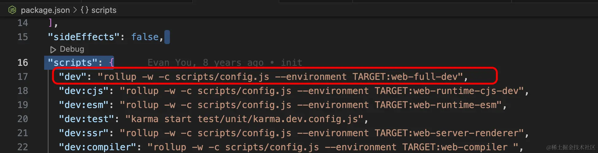 - 现在我们进入 package.json 文件,看scripts下的 dev 脚本,得知 vue.js是使用 rollup 打包的,脚本文件在 scripts/config.js 中,此时的 environment 为 TARGET:web-full-dev,先记住这个值,后面会用到;