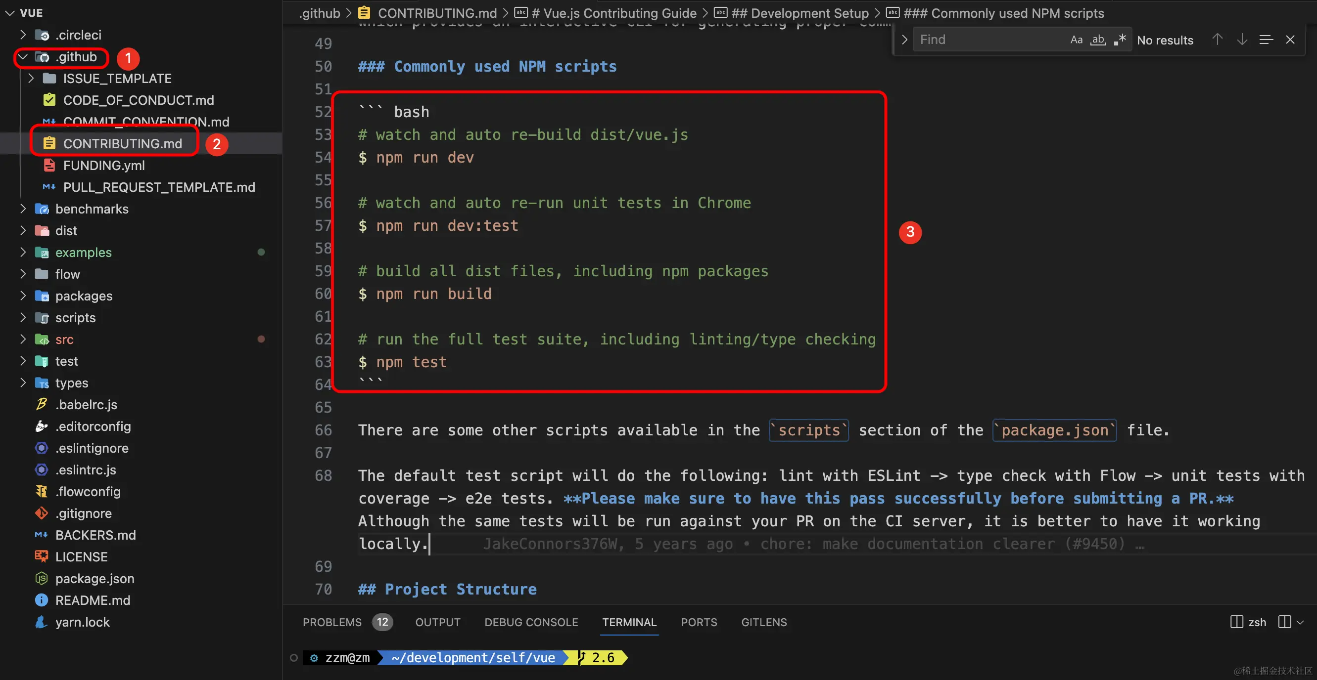 - 将 vue.js(以 v.2.6.14,也是 2.6 版本的终结版)clone 到本地之后,在一级目录中有一个 .github 的文件夹,里面的有一个 CONTRIBUTING.md 文件,可以查看 常用的 NPM 脚本;