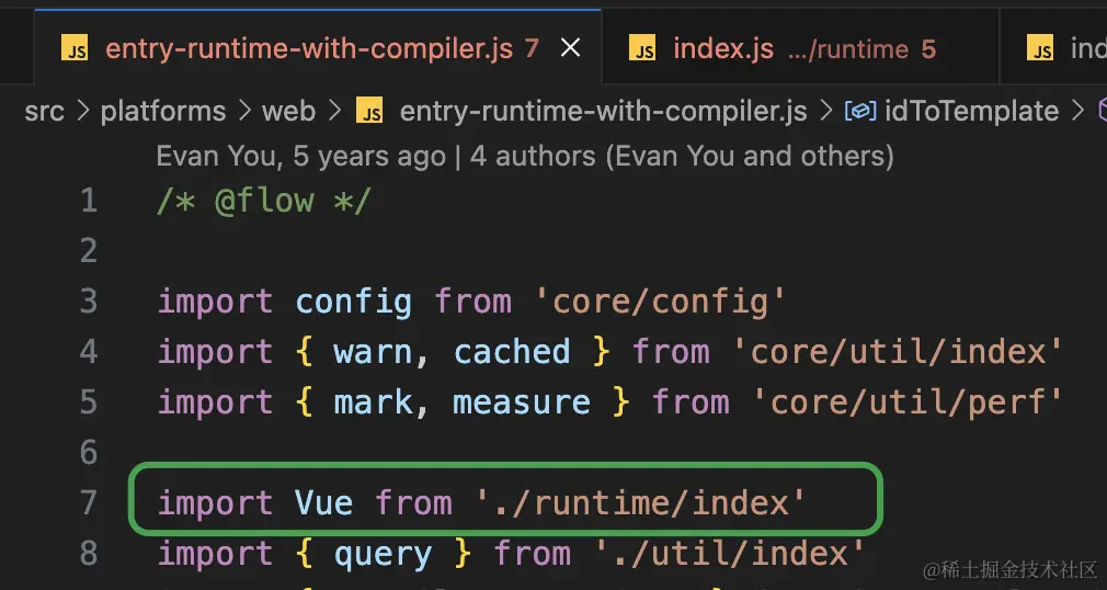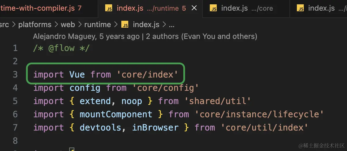 - 进入 entry-runtime-with-compiler.js 文件,看到 import Vue from './runtime/index',根据 import 继续找定义 Vue 的文件;