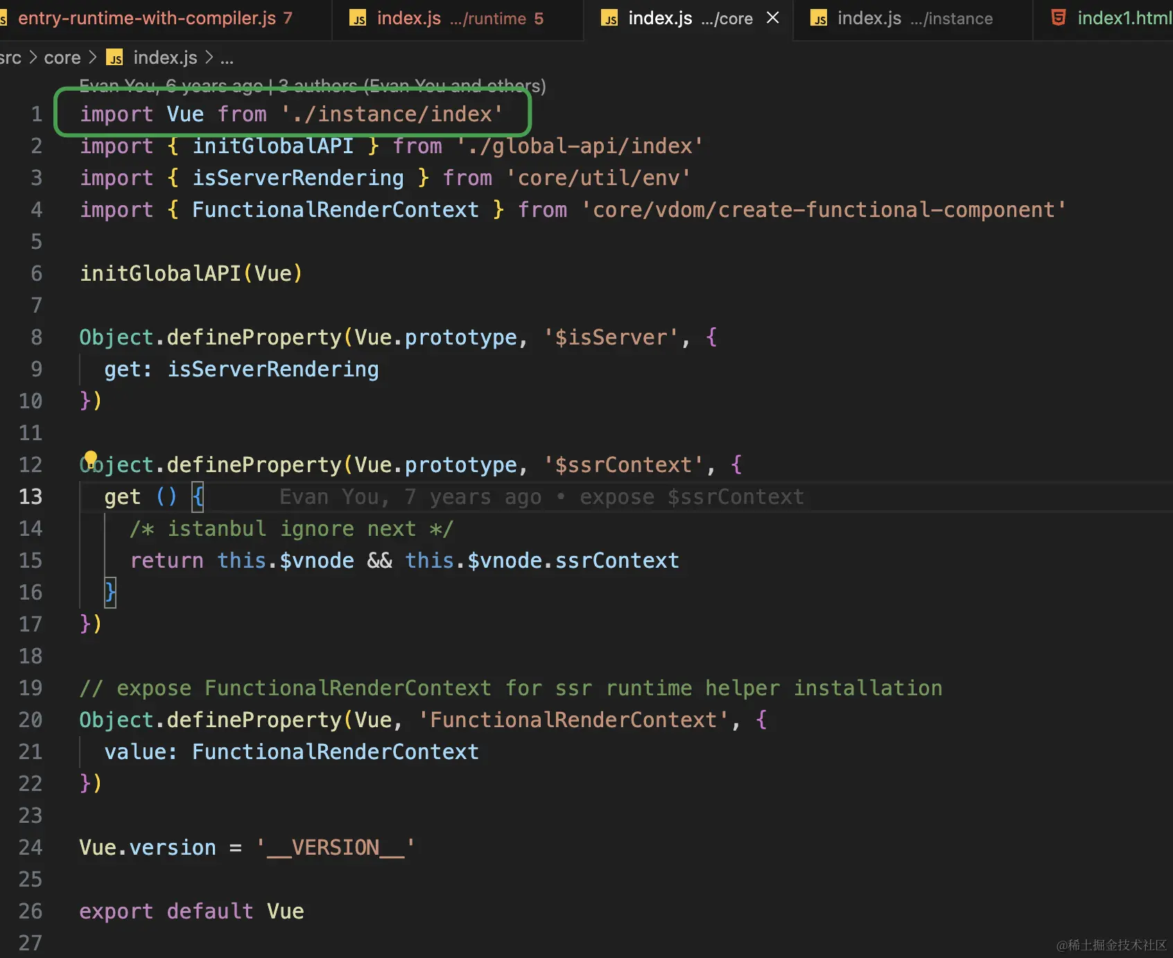 - 进入到 ./runtime/index,发现 Vue 是从外层导进来的( import Vue from 'core/index');