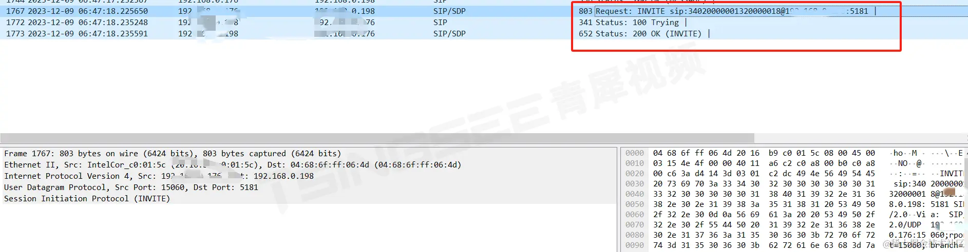 1)抓包后从包里看到,在平台请求invite消息后设备回复100 200ok,而平台未发送ack信息;