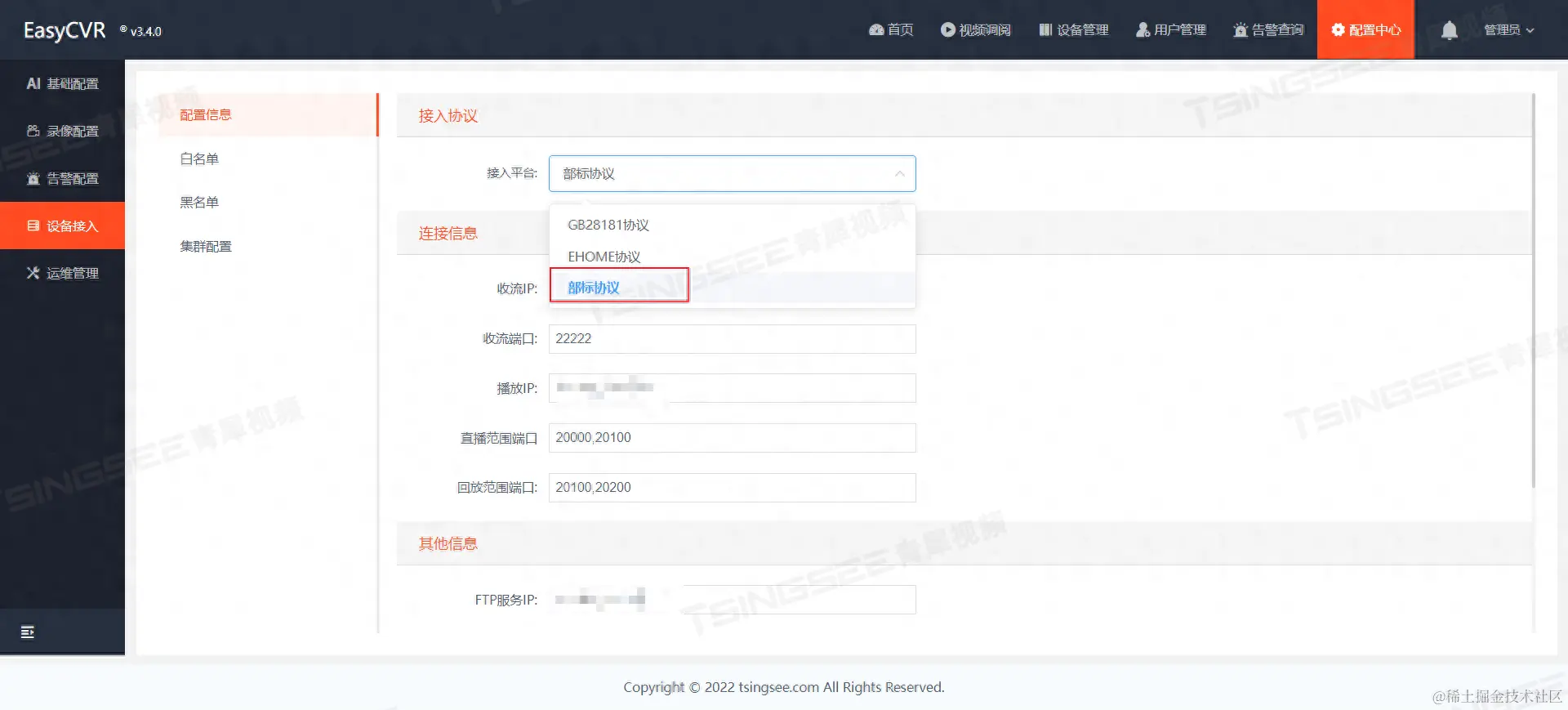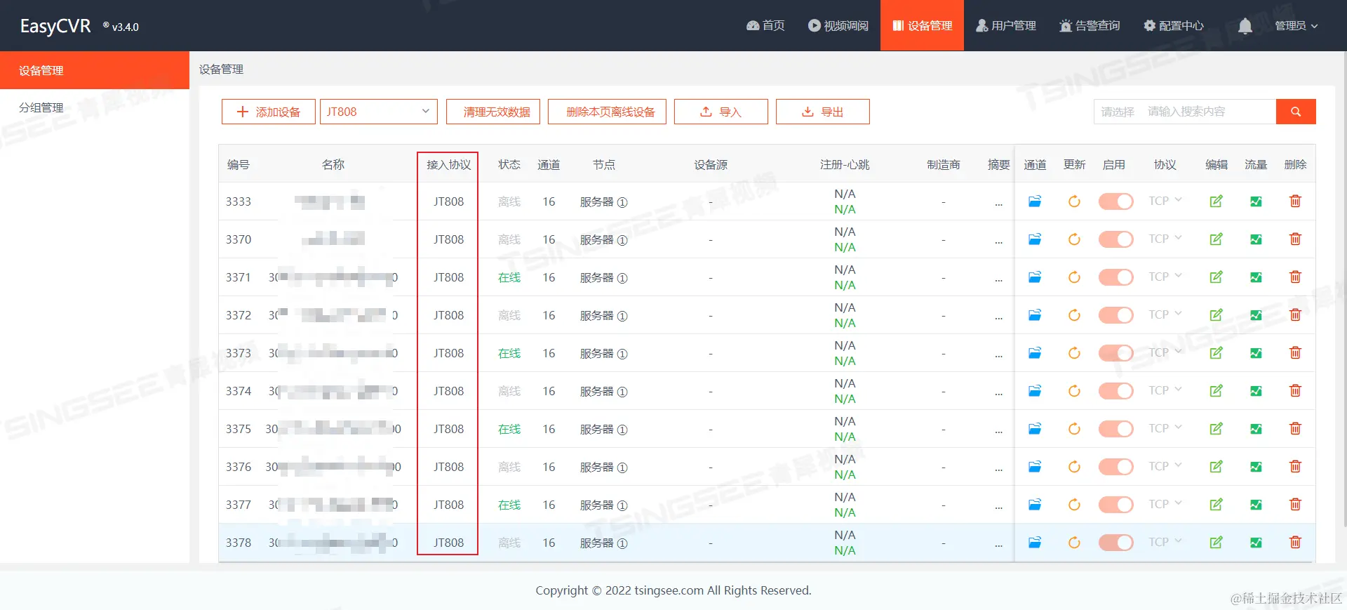 用户可在可视化监控云平台EasyCVR【配置中心】-【设备接入】中,在【配置信息】-【接入协议】下拉选择框中看到“部标协议”,可根据场景需求接入车载监控设备。成功接入后,能在设备管理页面进行查看、便捷等操作。