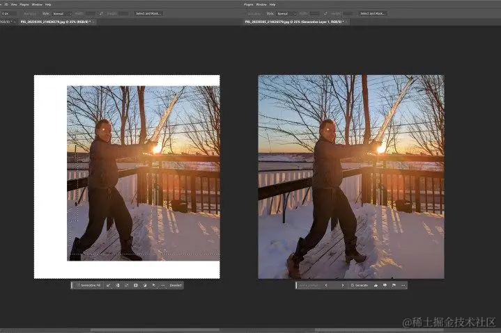前后截图显示 Photoshop 的 AI 如何扩展画布