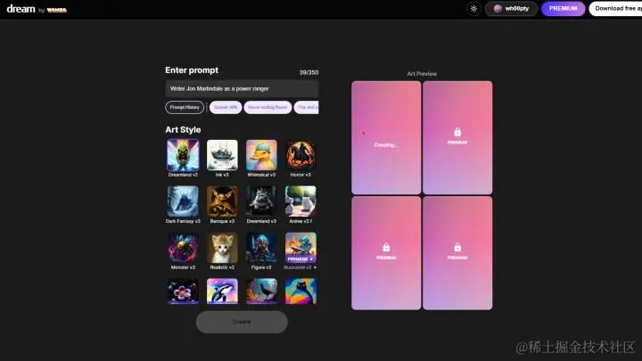 Dream可在 Web、iOS和Android上使用,是几乎适合任何人的图像生成器。它确实将您限制在几种图像艺术风格中,并且一次只能制作一张图像,除非您升级到高级版,但有很多选项可以调整。这里真正的卖点是它适用于任何设备和几乎任何平台,因此无论您想在什么设备上生成 AI 艺术,Dream 都是一个很好的解决方案。
