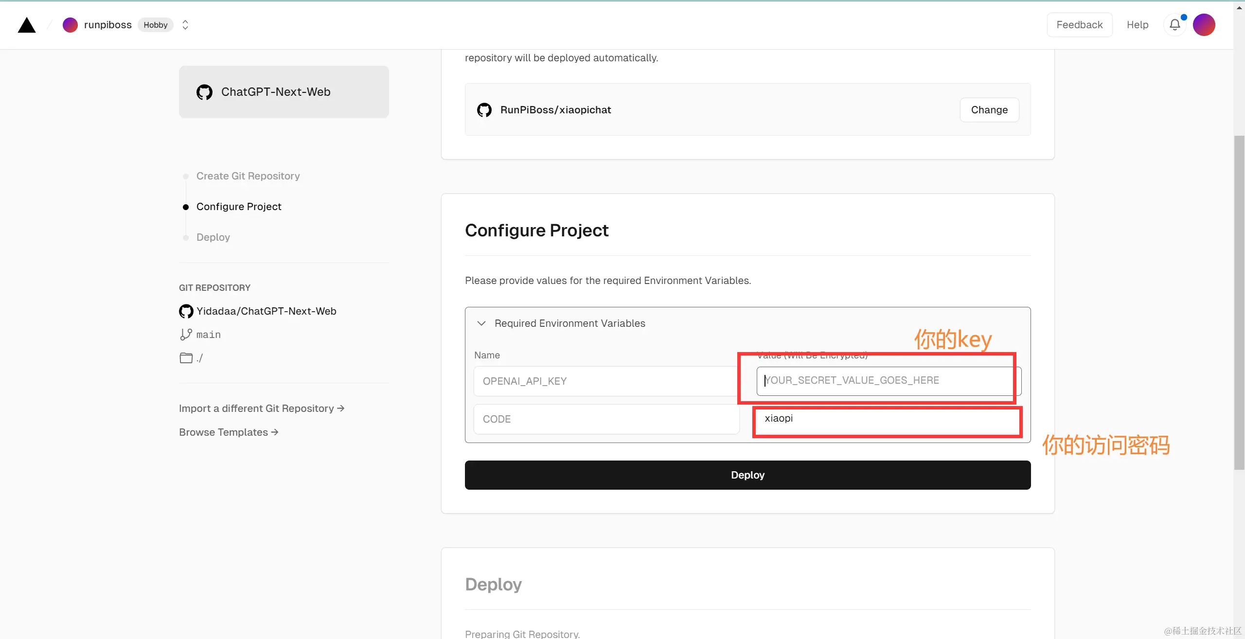 第三步,填写代理地址和api-key,点击Deploy开始部署,部署完成点击visit预览,会发现输入密码后无法正常对话。
