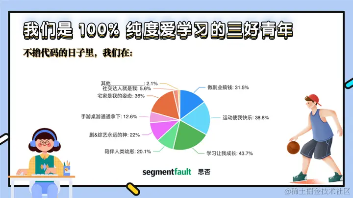 在不用撸代码的日子里,有 43.7% 的程序员选择学习提升自我,38.8% 的程序员花费较多时间在运动锻炼身体,这么看来,这可是 100% 纯度的热爱学习与运动的三好青年。