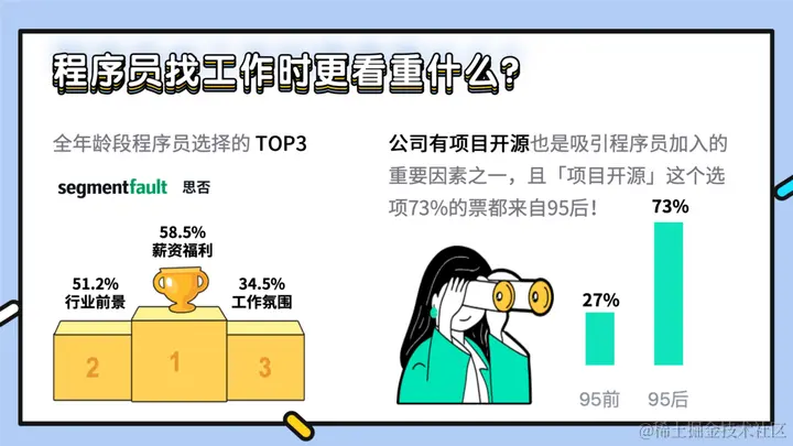 但小编还发现一个很有趣的点:求职公司有开源项目也会成为吸引 95 后程序员加入的重要因素之一,「项目开源」这个选项 73% 的票都来自 95 后;参与开源项目是一件非常酷的事情,在新一代开发者群体中流行了起来。