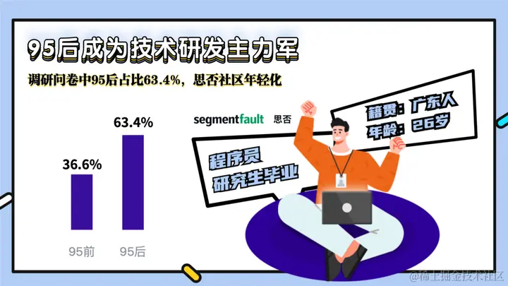 从调研数据来看,填写问卷的伙伴中 95 后占比 63.4%,因此可以看到思否社区的年轻用户在逐渐增多,你不妨观察下身边的开发同事,是不是有很多年轻的面孔呢?