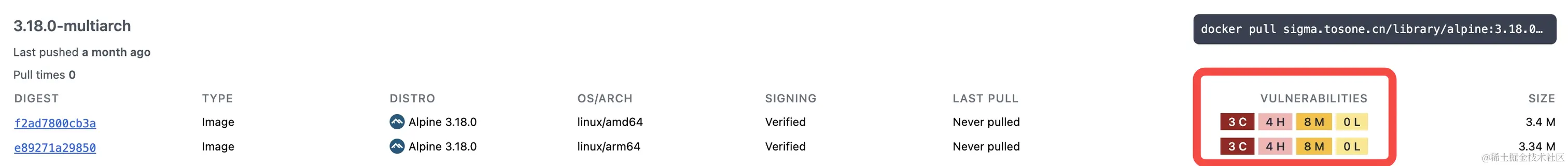 镜像元数据管理这里采用和 docker hub 比较类似的展示方式,在 repository 层级之下展示 tag,而不是像 Harbor 和 ghcr 一样展示 artifact,用户其实对于 artifact hash 值的展示不是那么理解,而 tag 是用户自己定义的东西,更容易理解一些,在对架构镜像的展示方式和 docker hub 保持一致。 在多架构镜像这里,会有类似 sbom 的 artifact 的内容推送到 artifact list 内,sigma 的前端将会仅展示 image、imageIndex、chart 等类型的 artifact,但是在 distribution-spec 标准接口上,sigma 还是会返回所有的 artifact。