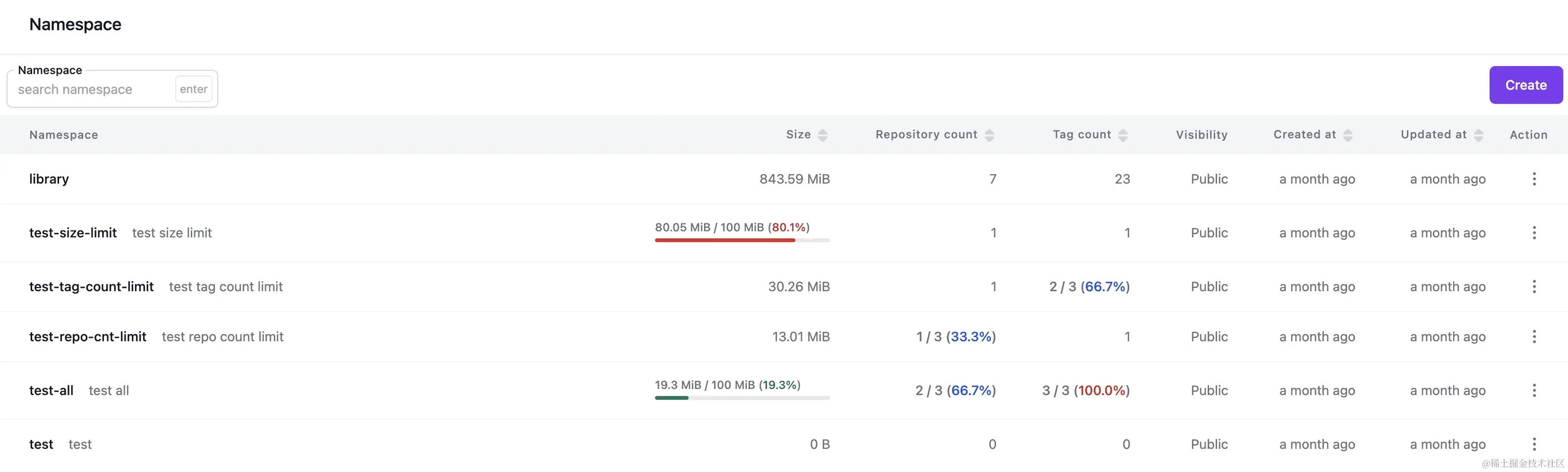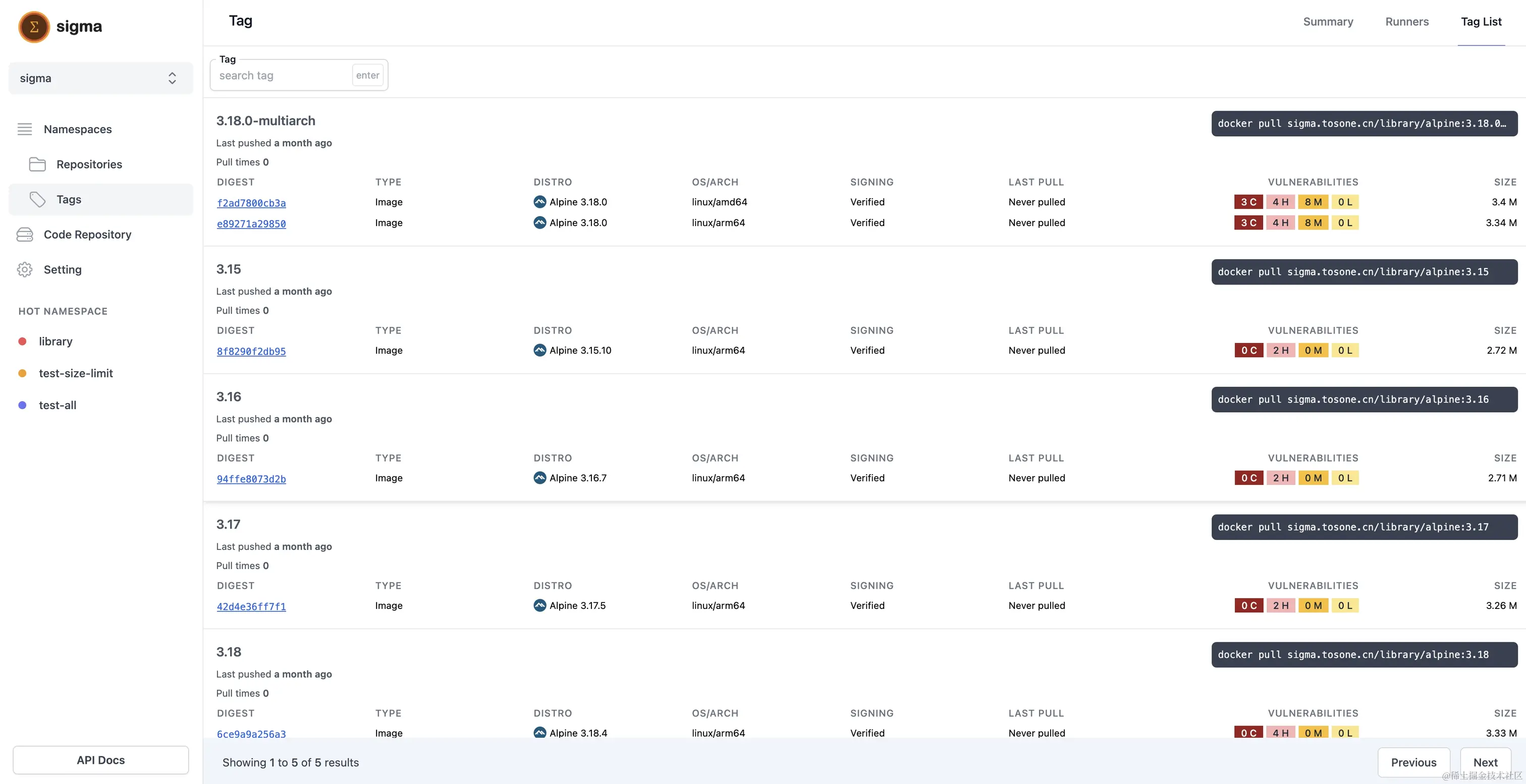 sigma 支持在 namespace 和 repository 设置 size 和 tag 上限,但其中遵循 namespace 和 repository 的从属容量限制关系。 在 namespace 页面上可以方便查看当前的容量使用情况,未来会支持当存储容量接近上限的时候发出对应的 hook event。如下图: