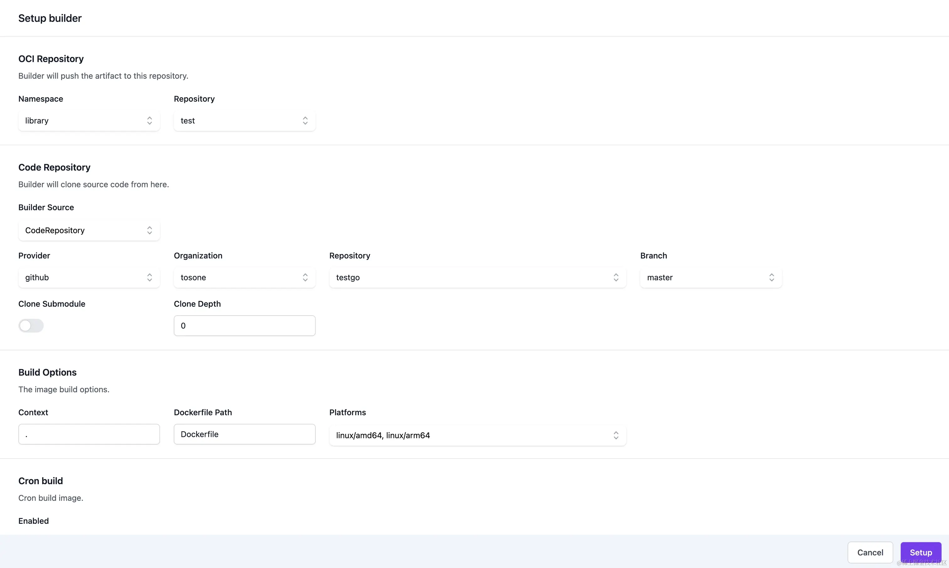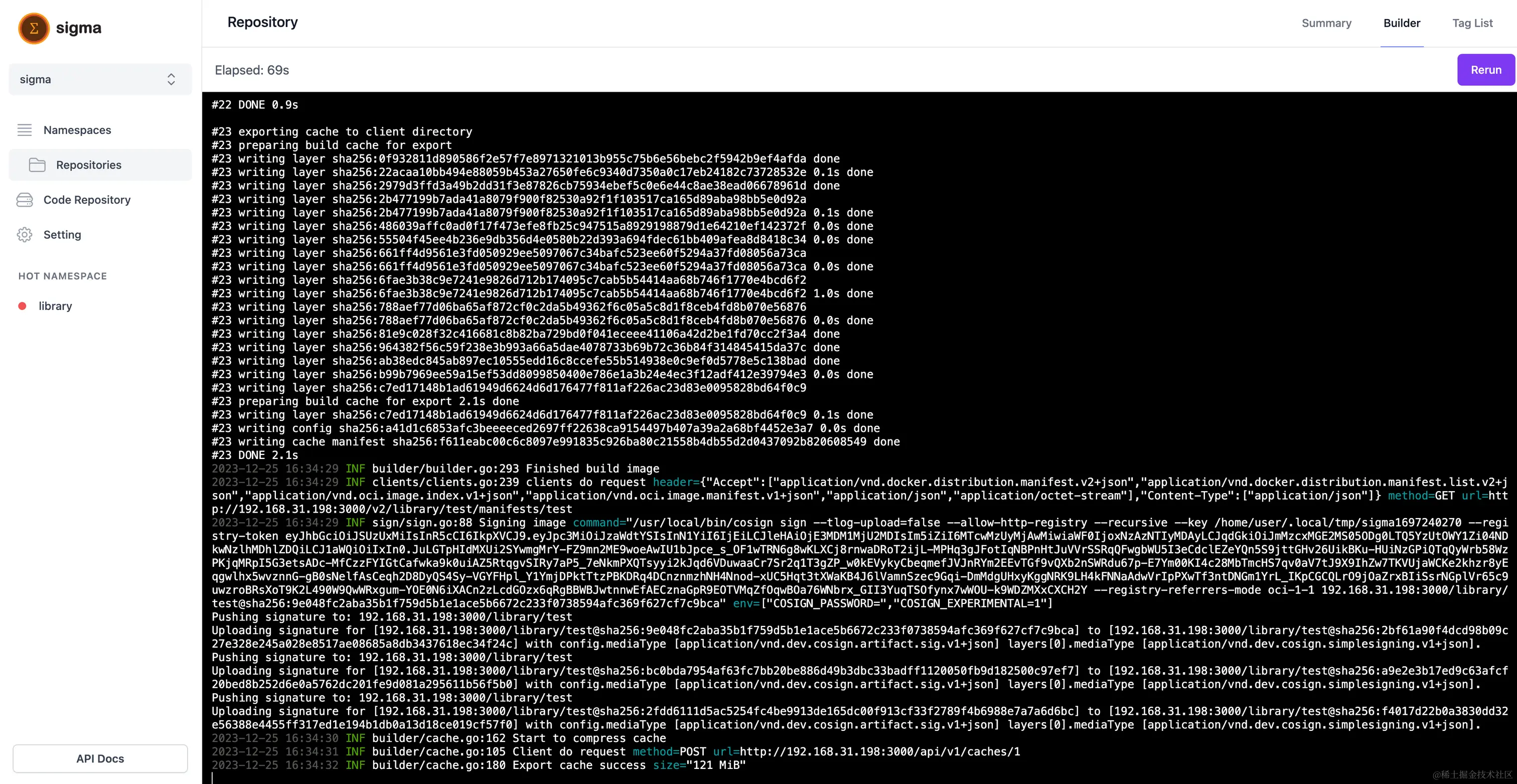 用户可以选择指定的代码仓库和代码仓库的分支,填写 Dockerfile 相关的构建参数,例如:构建架构,build args 等。 其中也支持定时任务的构建,也支持代码仓库的 hook event 触发构建,例如:push event,tag event 等。 sigma 在构建的时候随时可以对任务进行停止操作,在构建过程中会有实时的日志展示到前端。在 sigma 构建完成的时候会将构建过程中得到的缓存文件打包缓存到 sigma 对接的文件系统或对象存储中,到下次构建前会将缓存加载进来再做构建,构建任务完成之前还会对镜像使用 cosign 进行签名,签名使用的私钥为 sigma 启动时生成的私钥,存储在数据库中。