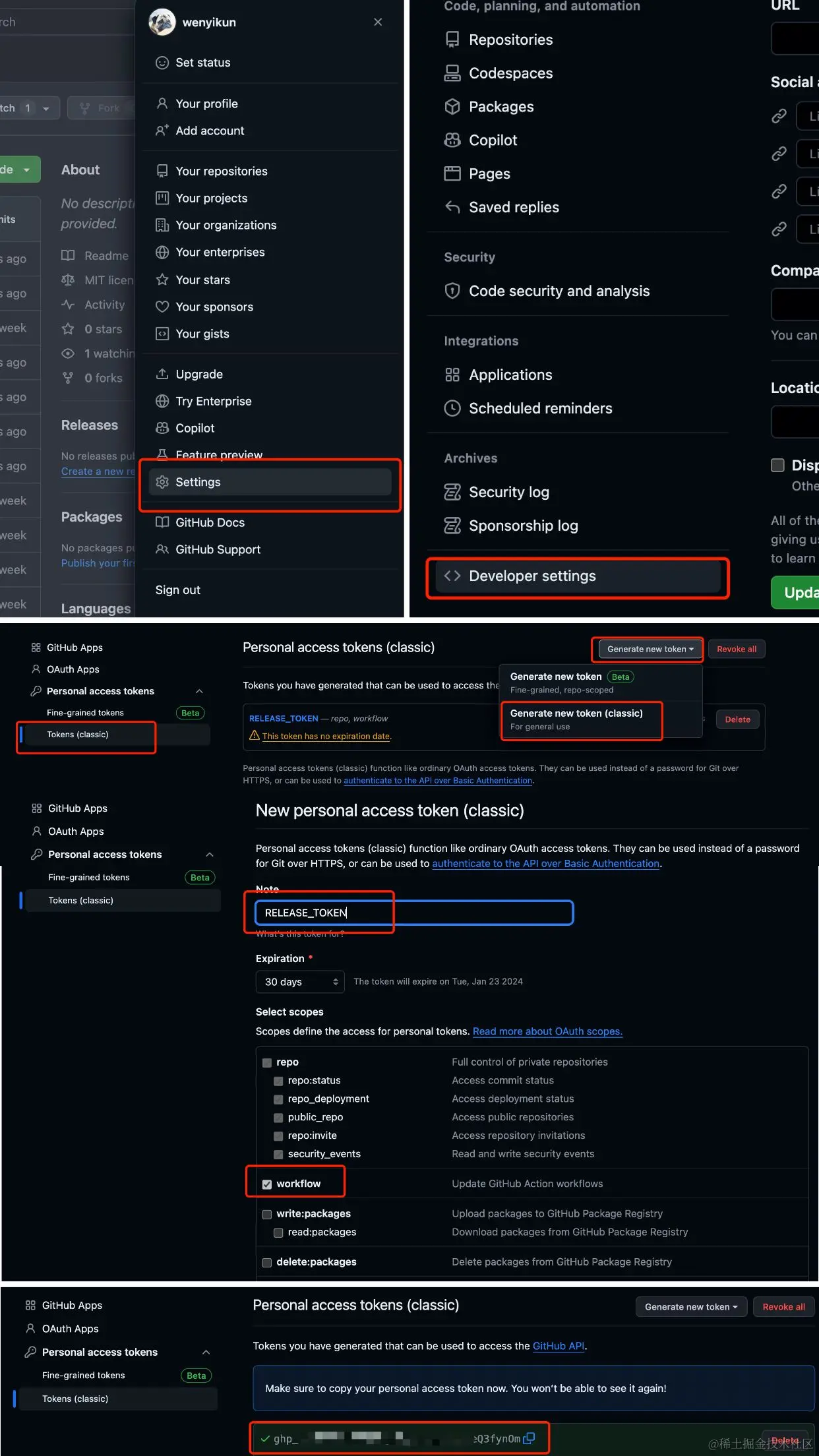 还有一个关键点是GH_TOKEN,你是否有疑问这个环境变量是哪里设置的?下面介绍一下如何设置。下面是在用户 Setting 模块设置 token 的流程。