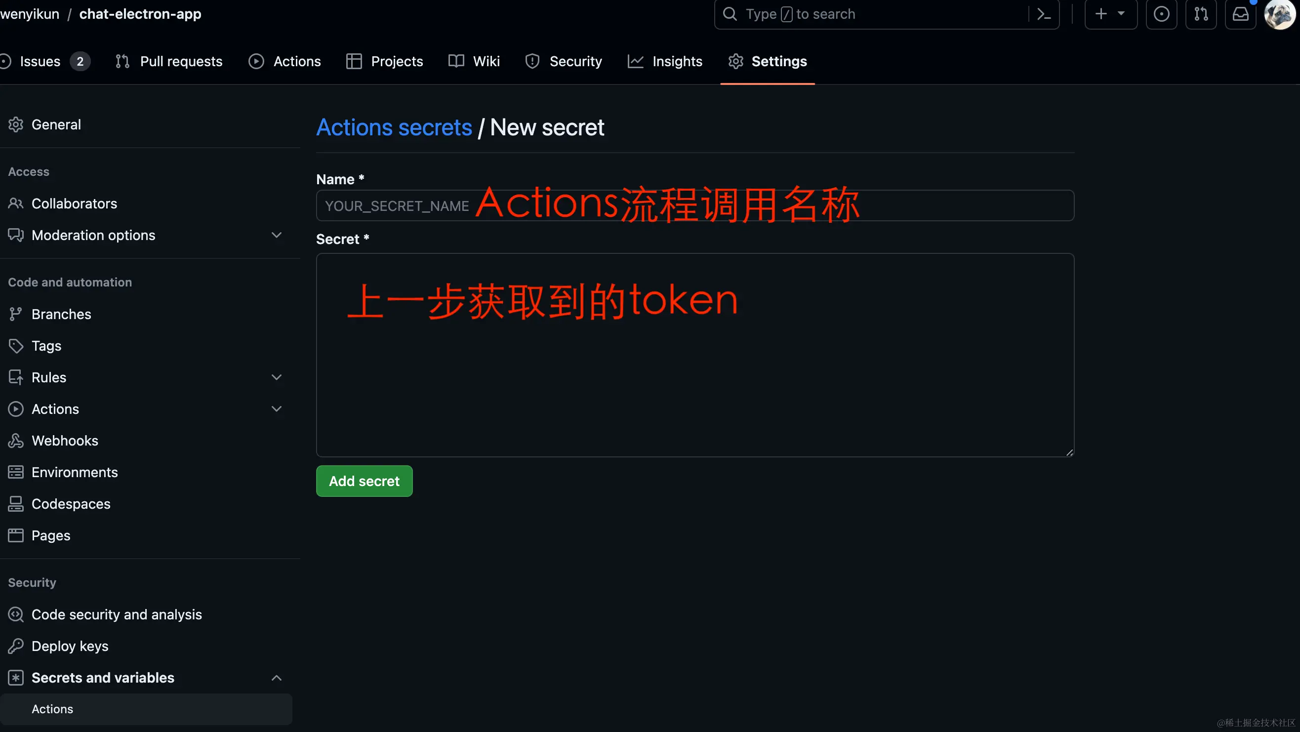 按照上面的图设置 token,最后复制新建的 token。然后回到项目仓库,按照如下流程设置秘钥参数。