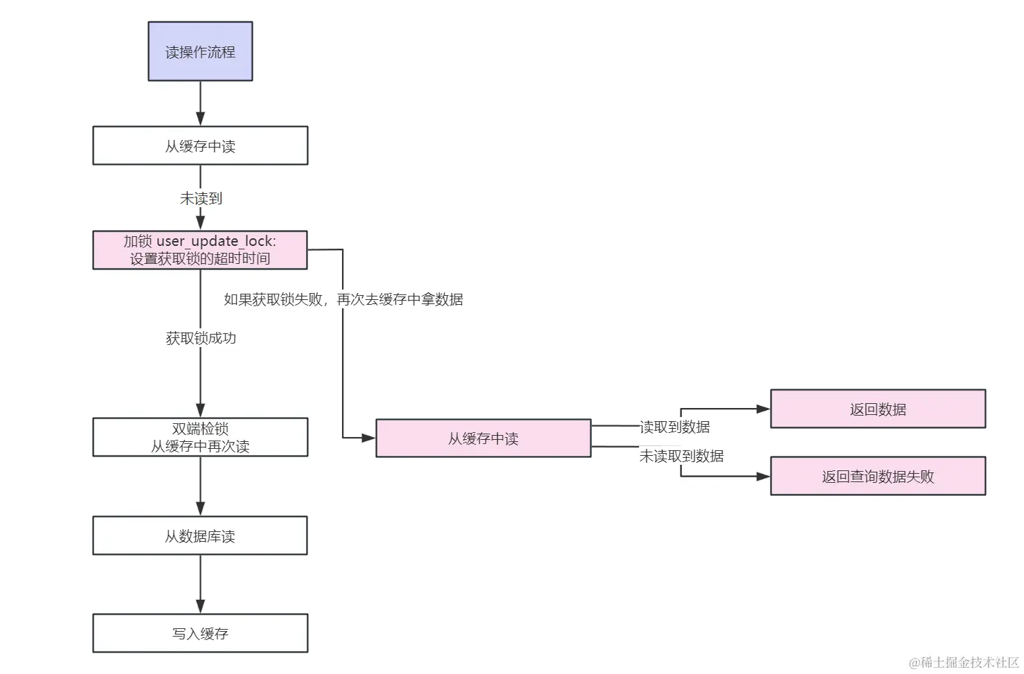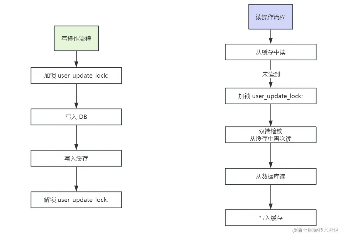 user_update_lock,那么在并发读的时候,先获取缓存内容,如果获取不到,尝试去 DB 中获取,此时就会阻塞等待锁user_update_lock,在写线程写完之后更新了缓存,释放锁,此时读线程就拿到了锁,此时在去数据库中查数据之前再加一个double check(双端检锁)的操作,也就是再尝试去缓存中取一次数据,如果取到了就返回;如果没有取到,就去数据库中查询
