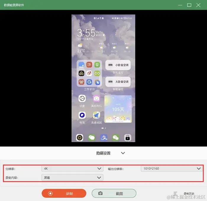 第3步:投屏成功后,我们可以在录制页面对录制内容、输出分辨率、分辨率进行调整,设置完毕后,就可以录制安卓手机了。