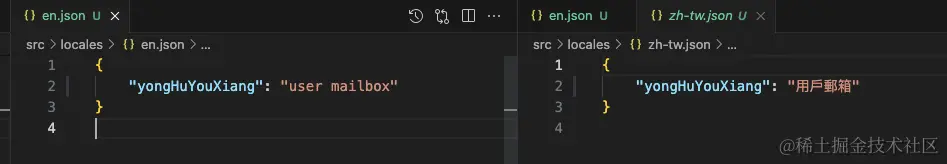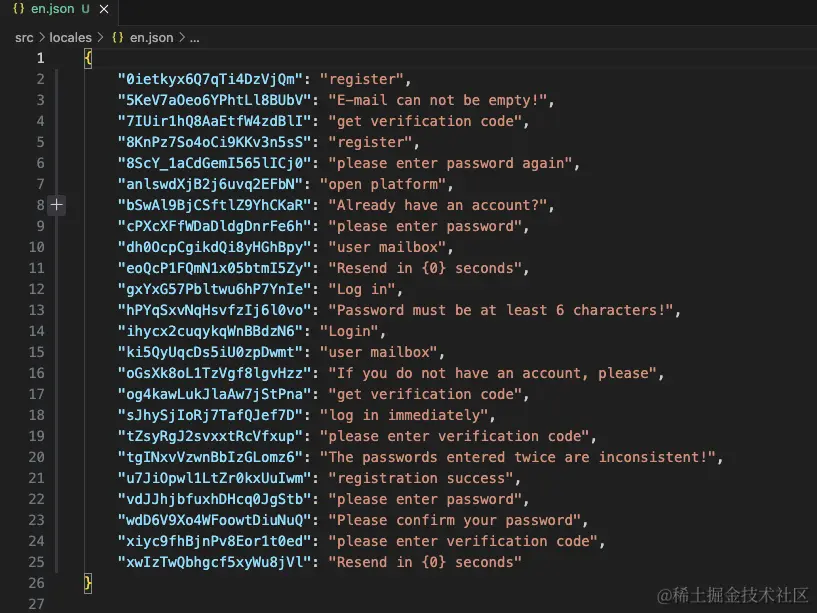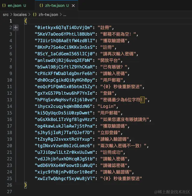 可以看到这里被我们替换为了指定的规则,看一下对应的翻译文案,我们在插件中设置默认的开发语言是zh-cn,这里添加之后会在zh-cn.json中添加上这个词条