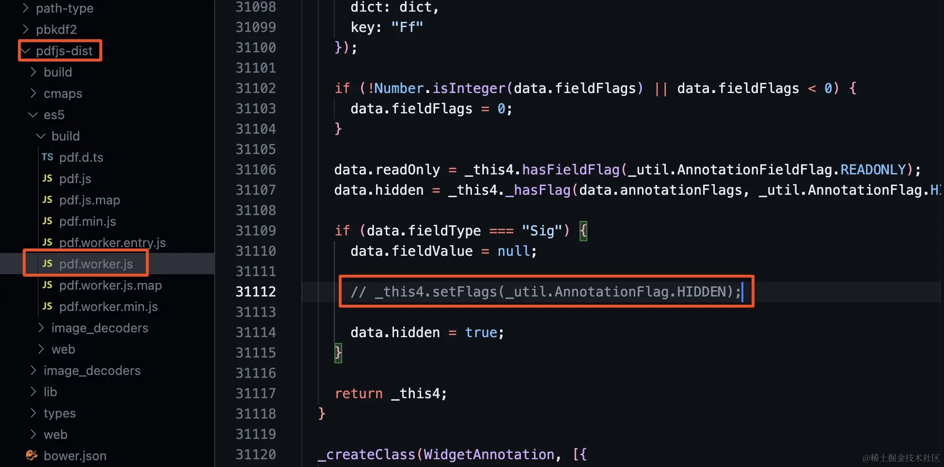 在本文示例中,在node_modules找到要修改的依赖包pdfjs-dist,修改代码如下: