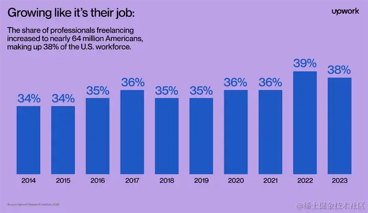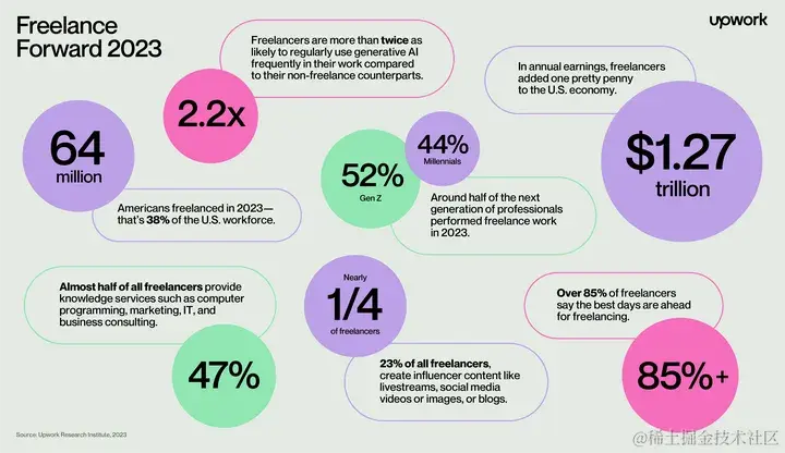 Upwork Research Institute 的 2023 年自由职业者调查是一项针对 3000 名专业人士的代表性研究,报告显示过去一年有 38% 的美国劳动力(即 6400 万美国人)从事自由职业,比上一年增加了 400 万。研究还发现,自由职业者为美国经济贡献了约1.27万亿美元的年收入。