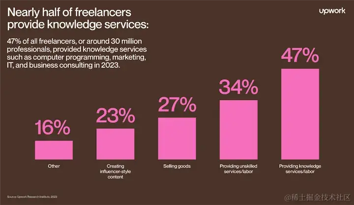 - 近一半的自由职业者提供知识服务:2023 年,47% 的自由职业者(约 3000 万专业人士)提供计算机编程、营销、IT 和商业咨询等知识服务。