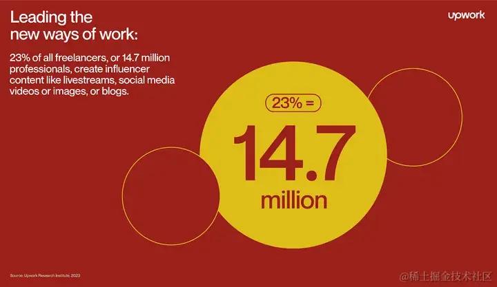 - 四分之一的自由职业者正在创建影响者风格的内容:2023 年,23% 的自由职业者,即 1470 万专业人士创建影响者内容,如直播服务、社交媒体视频、图像或博客。