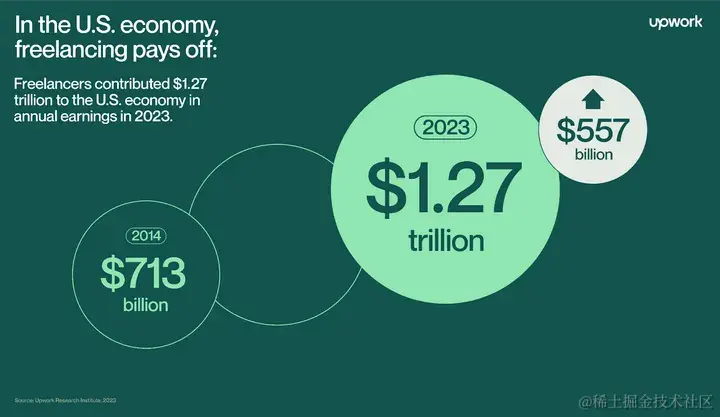 - 自由职业者仍然是美国劳动力市场和经济的重要组成部分:自由职业者在 2023 年的年收入中为美国经济贡献了 1.27 万亿美元。