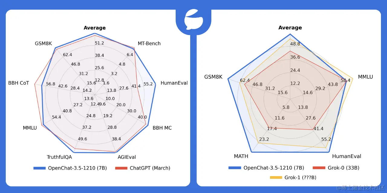 OpenChat-3.5作为一款先进的多模态语言模型,凭借其卓越的编码能力和通用化方法,在各类基准测试中表现突出。在GSM8K、MATH、HumanEval和MMLU等多个重要基准上,OpenChat-3.5不仅超越了ChatGPT和Grok,更重定义了LLMs的性能标准。