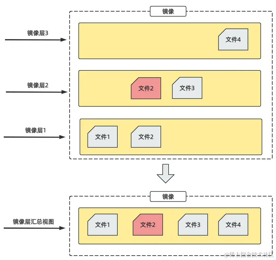 如果不同的镜像层中有相同路径的文件,则上层镜像层会覆盖下层镜像层的内容,如上图所示,由于第二层的文件2与第一层的文件2具有相同的文件路径,则镜像将以第二层的文件2内容进行展示,第一层的文件2会被第二层的文件2给覆盖,第一层只有文件1会被最终显示。