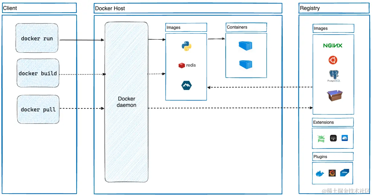 Docker 采用C/S架构,我们常使用的 docker 指令都是客户端 client,它会与 Docker Engine 后端服务进行通信,比如发送pull、build、run等命令给docker engine,而 docker engine 则是镜像和容器的大管家,负责从远端镜像仓库(Registry)拉取镜像、在本地存储镜像,还有从镜像生成容器、管理容器等所有功能。而镜像则存储在远端的 Registry 仓库里,客户端并不能直接访问镜像仓库。所以,在 Docker Engine 里,真正干活的其实是默默运行在后台的 Docker daemon,而我们实际操作的命令行工具"docker"只是个"传声筒"的角色。