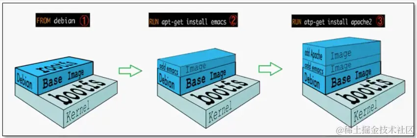 RUN apt-get install -y apache2:同理上一步,使用 debian 系统 apt-get 方式安装 apach2 软件,安装涉及的新增系统文件和配置变更都会保存到新增的镜像层里,对之前镜像层不会产生任何影响,同时 parent 指向上一层即步骤二产生的镜像; - 就这样不停地产生新镜像层,最后按照顺序将这些镜像层叠加到一起,就构建出一个完整的镜像。
