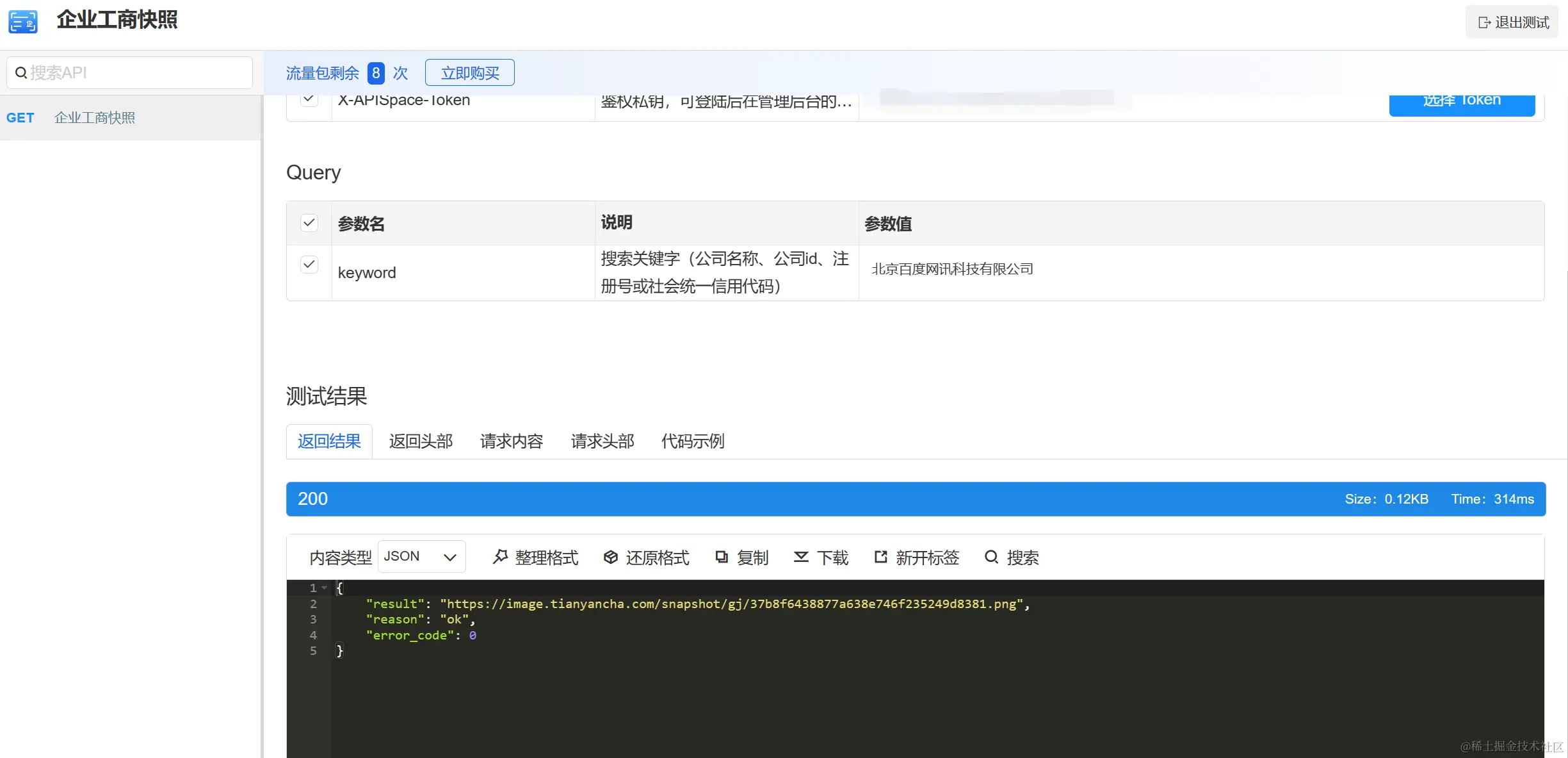 申请接口成功,进入测试页面,输入要查询的企业快速在线测试。