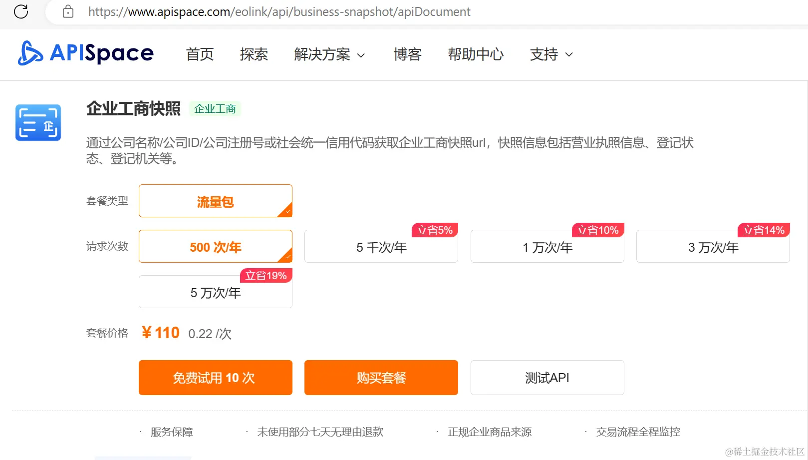登录 APISpace,点击进入 企业工商快照 的接口详情页,就可以申请接口了。APISpace 的 企业工商快照,通过公司名称/公司ID/公司注册号或社会统一信用代码获取企业工商快照url,快照信息包括营业执照信息、登记状态、登记机关等。