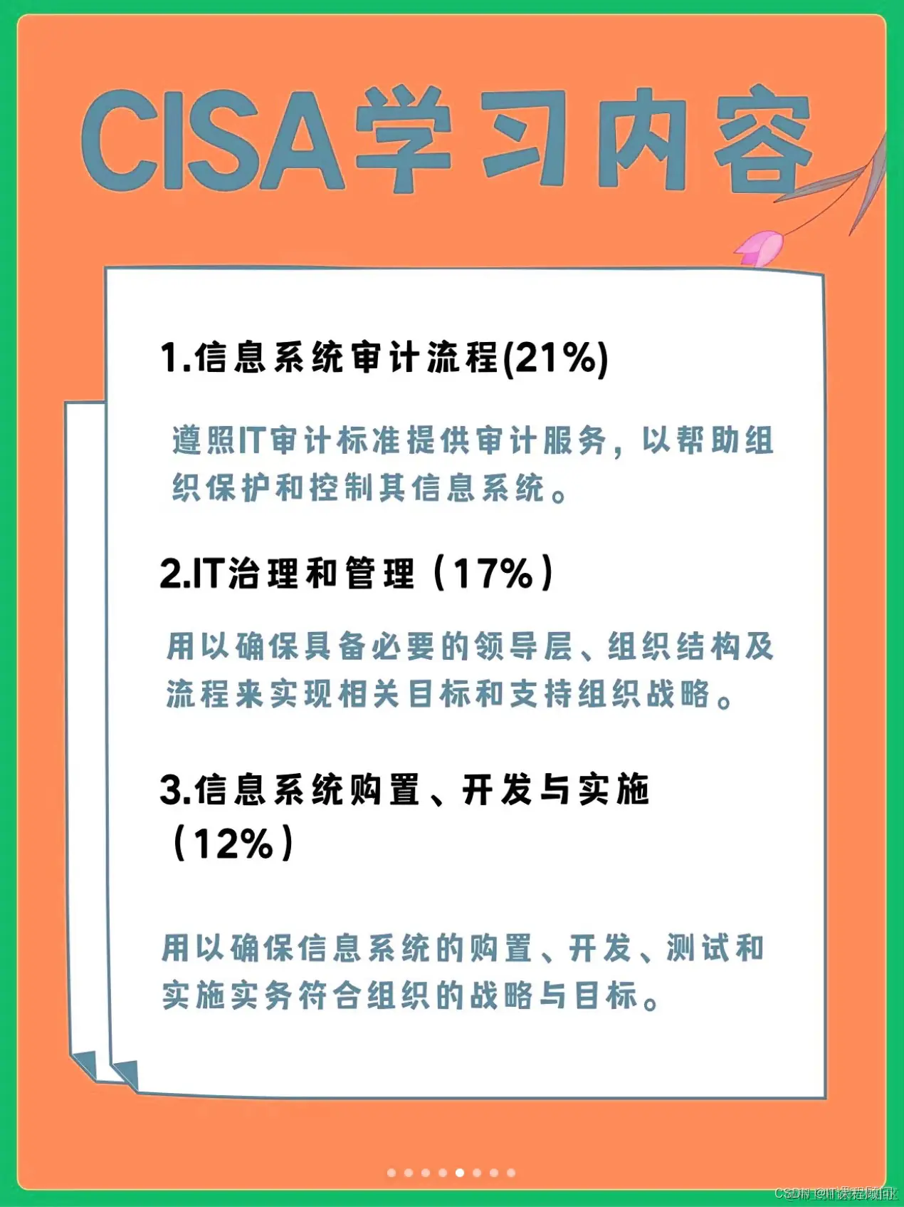 CISA课程涵盖了IT审计框架与标准、信息安全原理与实践、系统开发生命周期与控制措施、IT治理与风险管理、业务连续性与灾难恢复计划等核心知识。通过实际案例分析与实践操作,你将深入了解信息安全的方方面面,并培养解决实际问题的能力。