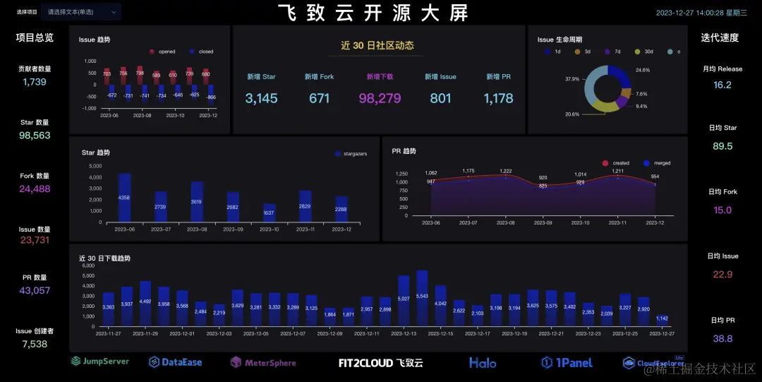 广大社区用户可以通过该大屏了解飞致云旗下开源项目的GitHub Star、Fork、Issue、贡献者等指标的数量信息,以及近30日内新增的Star、Fork、下载、Issue、PR数量等,同时该大屏还展示了飞致云旗下开源项目的Issue趋势、Commit趋势、PR趋势、Issue生命周期等。
