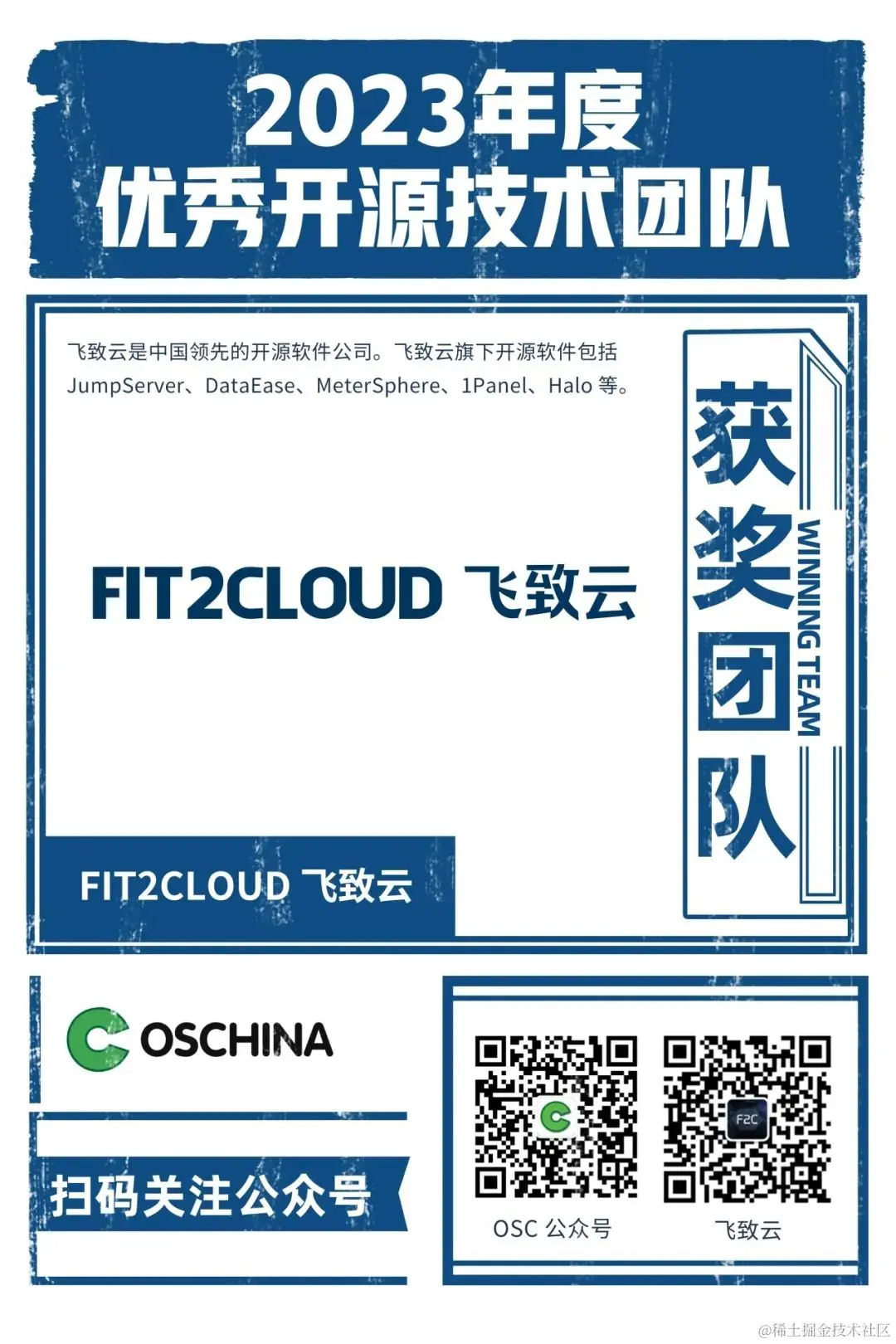 2023年12月8日,知名开源技术社区OSCHINA(开源中国)公布了“2023年度OSCHINA优秀开源技术团队”入选名单。凭借在开源软件研发和开源社区运营方面的年度优异表现,FIT2CLOUD飞致云再次收获 “优秀开源技术团队” 奖项。这也是继2021年和2022年之后,FIT2CLOUD飞致云连续第三年荣膺该项荣誉。