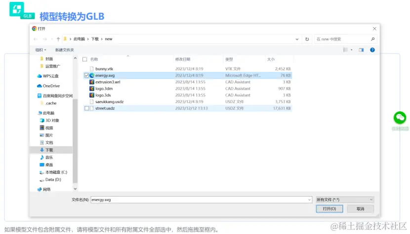 SVG转GLB网站也支持通过拖拽的方式,将文件进行上传。在资源管理器中,选择一份或多份模型相关文件,拖拽至SVG转GLB网站中的文件接收区域,即可完成3D模型文件的上传。