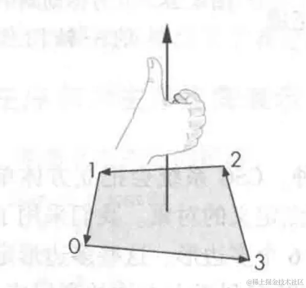0,3,2,1和 0,1,2,3 是不同的,是同一个多边形的两个面。在定义一个三维多边形时,必须注意顶点被指定的顺序。如果从外部观看一个对象的表面时,其顶点是按照逆时针遍历的,则这个表面称为是向外的,这个规则称为右手规则(right-hand rule),因为如果让右手四指指向遍历顶点的方向,那么拇指指向对象表面的外部。