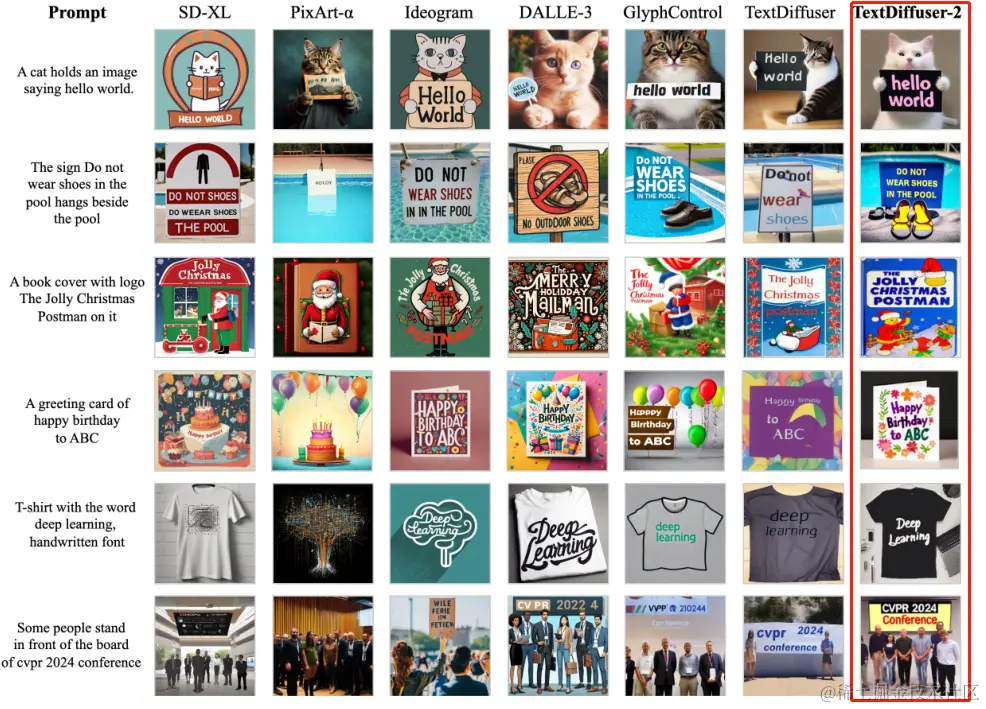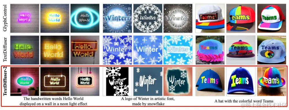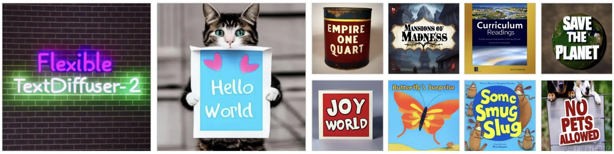 - TextDiffuser-2 能够生成更具艺术性的字体,增加字符位置和文本行倾斜角度的多样性。