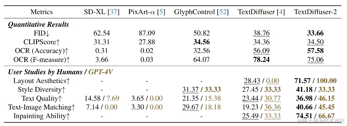 - 我们还将 GPT-4V 纳入用户研究中。最好和第二好的结果以粗体和下划线的形式表示。 TextDiffuser-2 在大多数指标下取得了最佳结果。