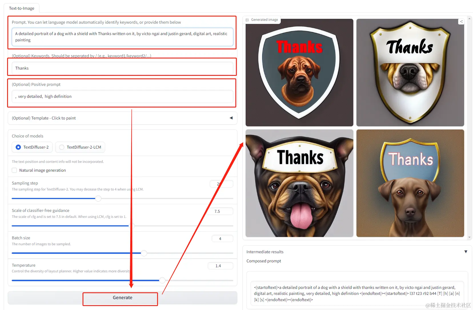 - TextDiffuser-2可以自动从提示中提取关键字以进行准确渲染。此外,TextDiffuser-2 生成的字体表现出广泛的多样性。